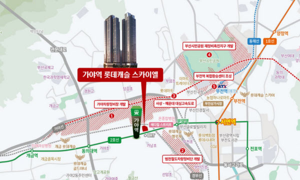 ‘가야역 롯데캐슬 스카이엘’은 부산 지하철 2호선 가야역 2번 출구 북쪽으로 맞붙은 부지에 들어서는 초역세권이다. 지하철을 이용해 부산 전역으로 이동할 수 있는 것이 입지적 장점으로 꼽힌다. 단지 북쪽으로 기차 노선이 지나는 가야역을 끼고 있는 대규모 철도 정비창이 있는데, 이 시설 때문에 소음이 심하고 조망권 등 미관상으로도 좋지 않다는 평가가 나온다.