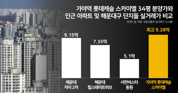 현재 가야역 일대 84㎡ 신축 아파트마다 5억~6억원대에 거래되고 있는 추세다. 인근 ‘서면비스타동원’(2023년·806가구) 84㎡가 올해 6월 5억1000만원에 팔리는 등이다. 이와 비교하면 ‘가야역 롯데캐슬 스카이엘’은 인근 시세 대비 거의 두 배 가까운 금액에 분양한다는 계산이 나온다.