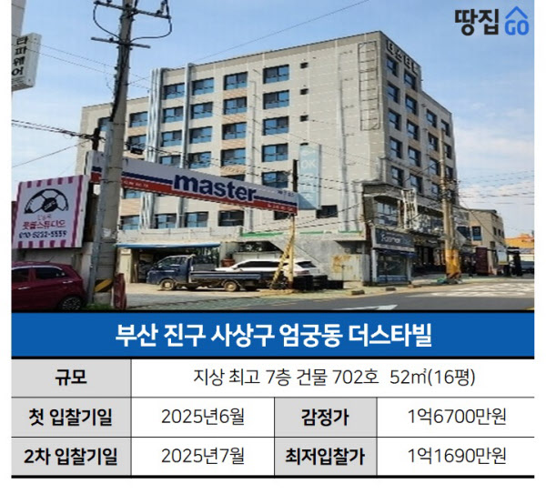 땅집고옥션(☞바로가기)에 따르면 이 물건은 부산광역시 사상구 엄궁동 ‘더스타빌’ 오피스텔 702호로, 전용면적 52.1㎡(약 16평)이다. 지상 7층 규모에 준공 6년차인 이른바 준신축에 해당한다. 사건번호는 2024타경105165다.