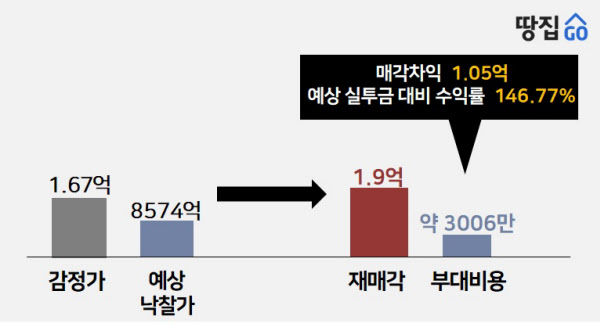 김기현 땅집고옥션 연구소장은 “현재 예상 낙찰가 기준으로 실투자금이 5000만원선인데 시세차익이 1억원을 넘을 것으로 보여 단기 투자 관점에서 수익률이 높은 편”이라며 “다만 전세 수요는 적고, 단지 규모가 작아 매각 전략을 확실하게 세우고 접근할 필요가 있다”고 했다.