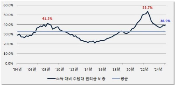 통계에 따르면 2025년 1분기 서울 지역의 주택구입부담지수는 155.7인 것으로 나타났다. 다시 말해 서울의 중간소득 가구가 서울의 중간가격 주택을 구입할 때 소득의 38.9%를 주택담보대출 원리금 상환에 써야 하는 수준이라는 뜻이다.