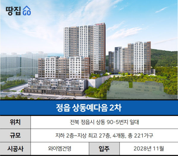 ‘정읍 상동예다음 2차’는 지하 2층~지상 최고 27층, 4개동, 총 221가구 규모다. 전체 물량을 일반분양하며 8월 4일 특별공급, 5일 1순위 청약을 나란히 받는다. 입주는 2028년 11월로 예정됐다. 시공은 와이엠건영이 맡았다.