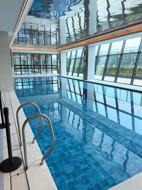최근 국내 최대 부동산 커뮤니티 ‘부동산스터디’에는 ‘포제스한강’ 커뮤니티와 가구 내부 모습 사진이 올라왔다. 가장 많은 찬사를 받은 곳은 수영장이다. 파란색 바닥 타일과 유리 마감 인테리어가 마치 고급 호텔 수영장을 방불케한다는 평가가 줄을 이었다. 천장에는 수영장 전체가 반사되는 자재를 배치해 개방감을 더했다. 레인 수를 강조하지 않고, 즐길 수 있는 공간을 강조했다.