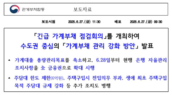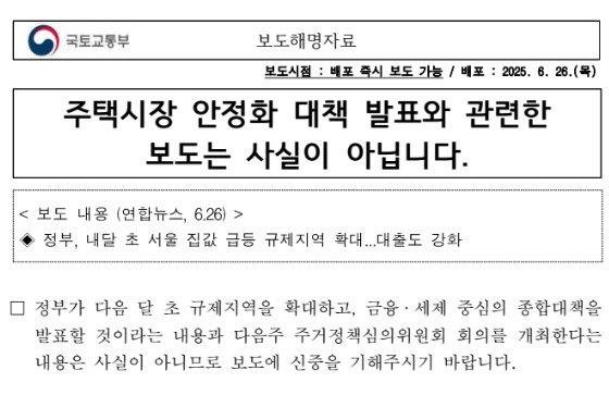 지난 6.27대책이 발표되기 하루 전, 한 언론이 “정부가 서울 규제지역을 확대하고 대출도 강화한다”는 기사를 보도했는데, 당일 국토교통부는 해명자료를 통해 “정부가 다음달 초 규제지역을 확대하고, 금융·세제 중심의 종합대책을 발표할 것이라는 내용이 사실이 아니다”라고 반박했다.