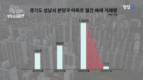 부동산 플랫폼 아실에 따르면, 분당구 아파트 매매 거래량은 6월 1300건을 넘었으나 7월 31일 기준 71건에 그쳤다. 한 달 만에 거래량이 약 95% 줄어든 셈이다.