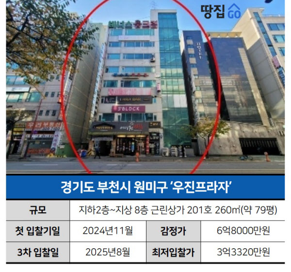 땅집고옥션(☞바로가기)에 따르면 해당 물건은 부천시 원미구 상동 532-8, 우진프라자 2층으로 전용면적 259.8㎡(약 79평) 규모 점포다. 사건번호는 2024타경53572. 최초 감정가는 6억8000만원이었지만 작년 11월 이후 유찰 2회를 거쳐 최저입찰가가 3억3320만원까지 하락했다. 감정가의 49% 수준으로 오는 12일 인천지법 부천지원에서 3회차 입찰을 진행한다.