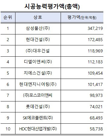 기술능력평가액(4위)을 제외한 나머지 부문에서 타사를 제쳤지만, 특히 경영평가액이 압도적이었다. 상한을 줄였음에도 경영평가액이 10조원은 넘은 곳은 삼성물산이 유일했다. 이 부문 2위인 DL이앤씨는 5조8738억원인데, 삼성물산의 29% 수준이다.