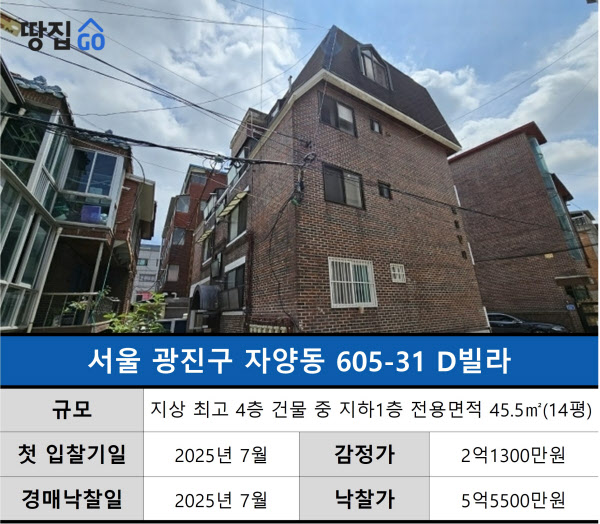 국내 최초 AI경·공매 퀀트 플랫폼 땅집고옥션(☞바로가기)에 따르면 해당 물건은 광진구 자양동에 있는 D빌라 지하층으로 전용면적 45.5㎡(약 14평)이다. 채무자 B씨가 새마을금고에서 빌린 돈을 갚지 못해 지난해 7월 경매 개시 결정이 났다.