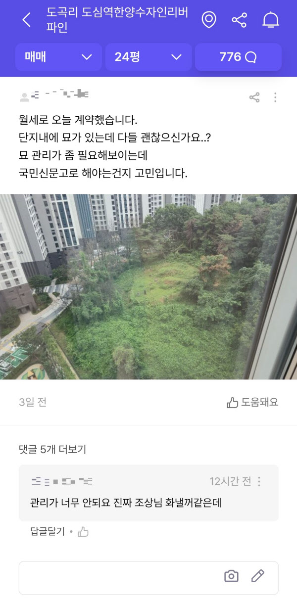 최근 이 단지에서 임대차 계약을 맺었다는 A씨는 “단지 안에 묘가 있는데, 다들 괜찮으신가요”라며 가구 내에서 바라본 묘지 사진을 올렸다. 그는 그러면서 묘지가 잘 보이는 동 대신 다른 동을 택했다고 했다.
