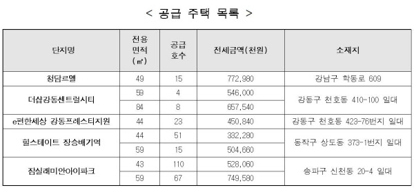 이번 공급 규모는 293가구로 모두 신규 입주 단지(서울시 재건축·재개발 매입형) 물량이다. 강남구 청담동 ‘청담르엘’(15가구), 강동구 천호동 ‘더샵 강동 센트럴시티’(12가구), ‘e편한세상 강동 프레스티지원’(23가구), 동작구 노량진동 ‘힐스테이트 장승배기역’(66가구), 송파구 신천동 ‘잠실 래미안 아이파크’(177가구) 등 4개 자치구의 5개 단지다.