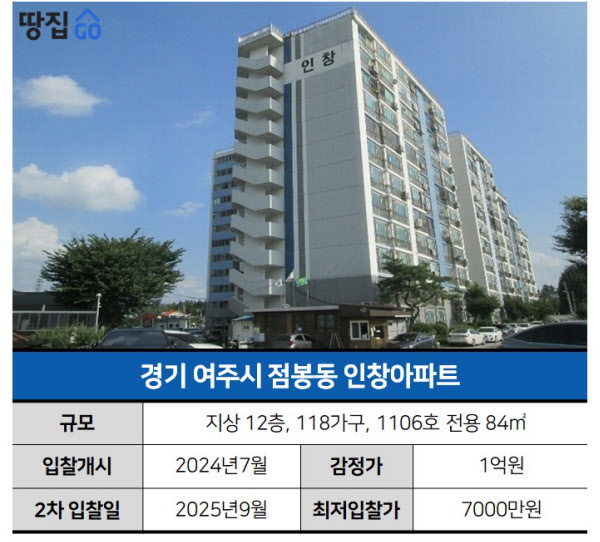 땅집고옥션(☞바로가기)에 따르면 해당 물건은 경기 여주시 점봉동 114 인창아파트 1동 11층, 33평형(전용면적 84㎡)이다. 사건번호 2024타경37600이다.