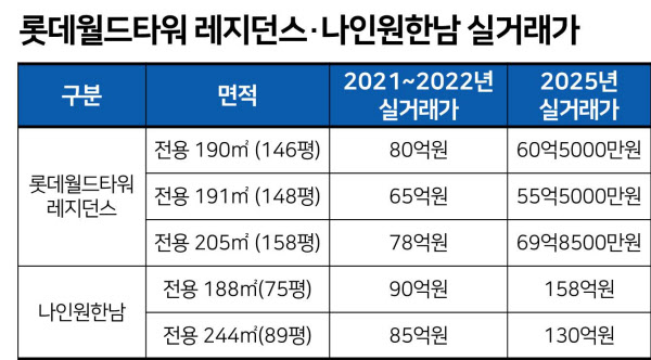 롯데월드타워 레지던스가 하락세를 겪는 것과 달리 하이엔드 아파트들은 연일 신고가를 경신하고 있다. 서울 용산구 한남동 '나인원한남' 전용 244㎡(89평)는 2021년 12월 90억원에서 올해 3월 158억원으로 68억원 올랐다. 전용 188㎡(75평)도 같은 기간 85억원에서 130억원까지 급등했다.