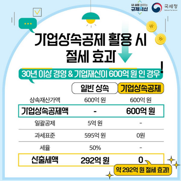 또 중소기업을 물려받게 된 자녀가 상속세를 신고하면서 전 기업주가 10년 이상 영위한 회사를 정상적으로 승계한 경우라면 최대 600억원까지 상속공제를 받을 수 있습니다. 가업승계에 따른 상속세 부담을 크게 경감시켜 주는 '가업상속공제' 덕분이죠.