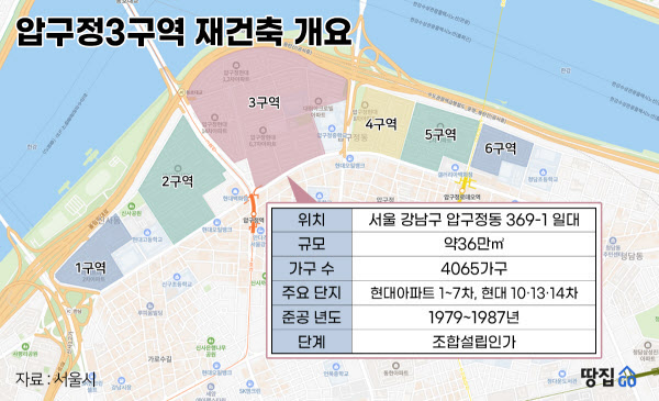 압구정 재건축 최대어로 꼽히는 3구역은 압구정동 현대 1~7·10·13·14차, 대림빌라트 등 총 4065가구 규모다. 3호선 압구정역과 가장 가깝다. 3구역 재건축 총 공사비는 압구정재정비구역 중 최고인 약 6조원에 달한다.