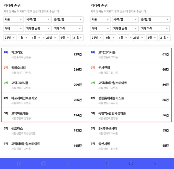 이는 올해 상반기(1-6월) 거래 순위와 사뭇 다르다. 상반기에는 송파구 신천동 ‘파크리오’(229건), 가락동 헬리오시티’(216가구)가 1, 2위를 차지했다. 각각 6864가구, 9510가구로 매머드급 아파트다. 그간 고덕그라시움과 고덕아르테온 등 강동구 신축 아파트의 경우 거래량 상위권에 들었으나, 송파구 주요 단지 거래량을 넘지는 못했다.