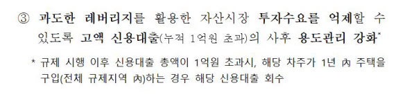 그는 “투기과열지역은 신용대출 1억원 이상을 받아 계약금을 낼 수 없다”며 “대출을 받고 집을 살 경우 대출회수는 물론이고, 주택 관련 대출이 금지될 수 있다”고 조언했다.