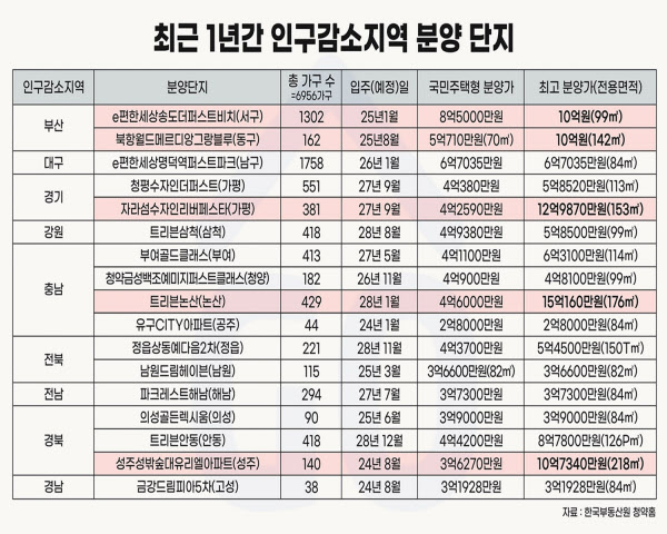 지난해 충남 논산에 분양한 ‘트리븐논산’의 경우 국민주택형 분양가가 4억6000만원 선, 가장 큰 주택형인 176㎡(68평·이하 전용면적)는 분양가가 무려 15억160만원에 달했다. 수도권 인구감소지역인 경기 가평에 분양한 ‘자라섬수자인리버페스타’의 경우 역시 국민주택형은 4억2590만원, 최고 분양가(153㎡·59평)는 12억9870만원 수준이었다.