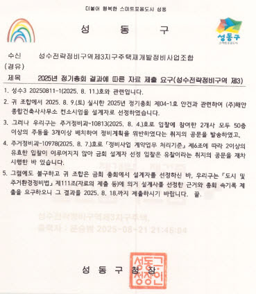 설계사 선정 이후 성동구청은 성수3지구 조합에 “설계자 선정 입찰은 유효할 수 없다”는 취지의 공문을 재차 보내며 강하게 제동을 걸었다. 이어 도시 및 주거환경정비법 제111조에 따라 설계자 선정 근거자료와 총회 속기록 제출을 요구했다. 조합은 지난 20일자로 ‘2025년 정기총회 설계자선정 근거 및 속기록 송부’ 문서와 경위서를 구청에 제출하며 정당성을 주장하고 있다.