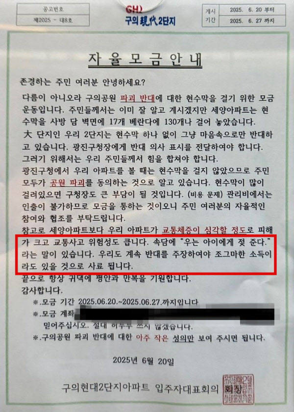 입주자대표회의 회장 A씨는 “옆 단지(세양아파트)가 베란다에 130개 현수막을 걸어놨지만, 대단지인 우리는 현수막 없이 마음속으로만 반대하고 있다”며 “주민들이 힘을 합쳐 광진구청장에게 반대 의사를 전달해야 한다”고 했다. 이어 “관리비에서 (현수막 관련) 인출이 불가해 모금을 하오니 자율적인 참여와 협조 부탁한다”고 덧붙였다.