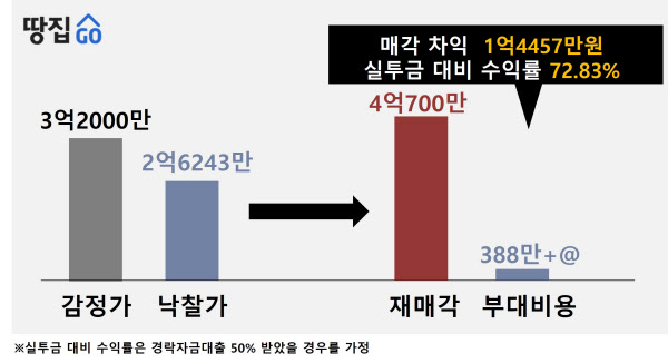 A씨는 해당 물건을 낙찰받고 약 10개월 뒤인 올 6월 초 4억700만원에 매각했다. 땅집고옥션 AI 추정 시세보다 7000만원쯤 높은 것으로 단순 매각차익만 1억4457만원에 달했다. 중개수수료·대출이자·세금 등 각종 비용을 제외한 순수익은 약 9839만원이다.