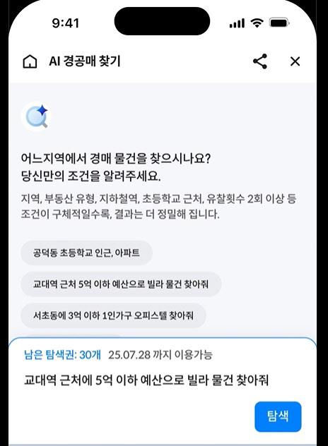 ‘AI땅집봇’은 마치 챗GPT와 대화하듯 원하는 경·공매 물건을 인공지능(AI)에게 물어보기만 하면 내 상황에 가장 적합한 경·공매 물건을 추천받을 수 있는 신개념 서비스다. 예를 들어 ‘공덕동 초등학교 인근 아파트’, ‘교대역 근처 5억원 이하 빌라’ 등 상세 조건을 입력할수록 더 정밀하고 개인화한 추천 결과를 알려주는 식이다.