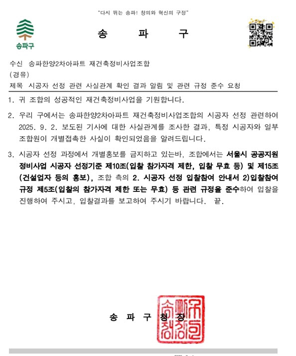 4일 송파구청은 송파한양2차 재건축 조합에 “특정 시공자와 일부 조합원이 개별 접촉한 사실이 확인되었다”면서 “시공사 선정 과정에서 개별 홍보를 금지하고 있는 바, 관련 규정을 준수하여 입찰을 진행해 주시고 입찰 결과를 보고해주시기 바란다”는 내용의 공문을 전달했다.