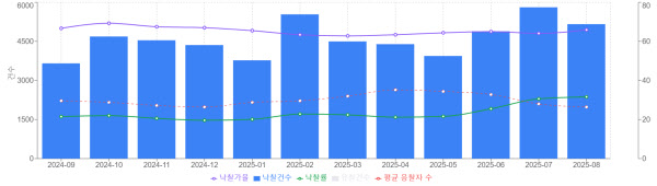 국내 최초 경·공매 AI퀀트 분석 플랫폼 땅집고옥션(☞바로가기)에 따르면, 지난 8월 한 달간 법원 경매에 부쳐진 부동산은 총 1만6303건, 이 가운데 낙찰 물건은 5190건으로 낙찰률 31.8%를 기록했다. 지난 7월에는 총 1만8842건 중 5809건이 낙찰돼 30.8%의 낙찰률을 기록했다. 낙찰 건수는 줄었지만 낙찰률은 상승했다.
