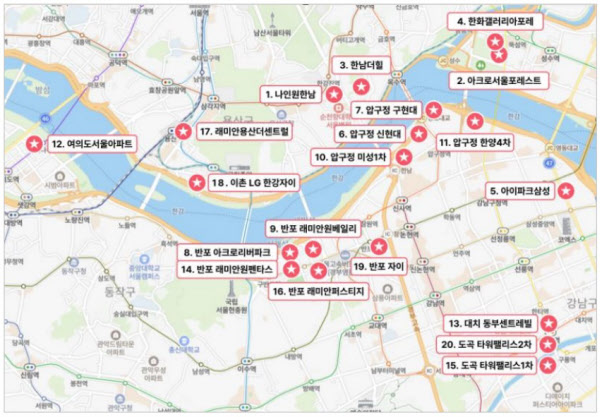 자료에 따르면 1가구당 평균 추정 가격순으로 ▲한남동 ‘나인원한남’ 144억7022만원 ▲성수동1가 ‘아크로서울포레스트’ 89억3495만원 ▲한남동 ‘한남더힐’ 85억3046만원 ▲성수동1가 ‘한화갤러리아포레’ 79억2543만원 ▲압구정동 신현대 62억7554만원 등이다. 여기서 범위를 더 넓혀 상위 20개 단지까지 봐도 대다수가 4개 동네 위주로 자리 잡은 사실이 확인됐다.