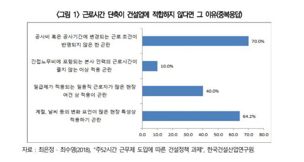 한국건설산업연구원 조사 결과, 근로시간 단축이 건설업에 적합하지 않은 이유에 대해 ‘공사비 혹은 공사기간에 변경되는 근로 조건이 반영되지 않는 한 곤란’이라는 응답이 70%로 가장 높게 나타났다. 다음으로 ‘계절, 날씨 등의 변화 요인이 많은 현장 특성상 적용하기 곤란’이라는 응답이 64.2%로 뒤를 이었다.