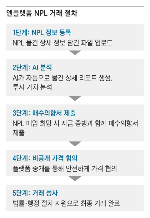 엔플랫폼은 이같은 부실채권 거래 병목을 풀기 위해 만든 온라인 플랫폼이다. 엔플랫폼에서 NPL 을 사고 파는 프로세스는 5단계다. ▲부실채권 자산 등록 ▲AI 기반 자동 분석 ▲매수의향서 제출 ▲비공개 가격 협의 ▲거래 성사·행정지원 등이다.