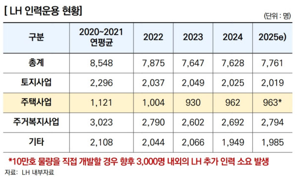 주산연은 “LH가 10만 가구를 직접 개발할 경우 추가 인력만 3000명 이상 필요하다”고 분석했다. 하지만 정부 차원의 충원·재배치 방안은 뚜렷하지 않다. 업계 관계자는 “전세사기 대응, 매입·전세임대 확대, 주거급여 등 수탁 업무까지 떠안으면서 LH 내부에서는 업무 과부하도 누적되고 있다”고 말했다.