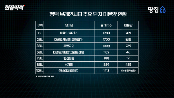 평택 브레인시티의 본격 분양이 시작된 2023년 이후 성적은 초라하다. 지난해 12월 분양한 1블록 ‘중흥S-클래스’는 1879가구 모집에 청약자 340명(0.18대1)에 그쳤고, 같은 해 공급된 3블록 ‘푸르지오’도 1990가구 규모였지만 경쟁률은 0.16대1에 불과했다. 올해 들어서도 5블록 ‘대광로제비앙 그랜드센텀’(0.6대1), 7블록 ‘한신더휴’(0.5대1), 8블록 ‘수자인’(0.11대1) 등 줄줄이 미달됐다. 현재 6개 단지에서만 2000가구 이상 미분양이 쌓여 있다.