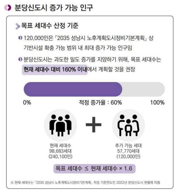 성남시 관계자는 이러한 가이드라인은 ‘2035 성남시 노후계획도시 정비기본계획’을 통해 이미 고시된 사항이라고 설명했다. 2022년 기준 분당은 9만8683가구, 인구 24만100명으로 재건축 시 기반 시설 확충 가능 범위 내에서 최대로 증가 가능한 인구수는 12만명, 가구수로는 5만7700가구다. 현재 가구수 대비 60% 수준으로 160% 상한의 근거가 된다.