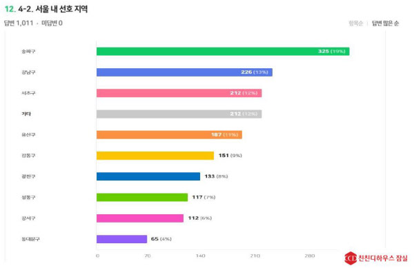 세부적으로는 송파구가 325명으로 가장 많았고, 이어 강남구 226명, 서초구 212명 순이었다. 응답자들은 ▲의료·문화 인프라 밀집 ▲탁월한 교통 접근성 ▲안전한 생활 환경 등을 강남권을 선택한 주요 이유로 들었다.