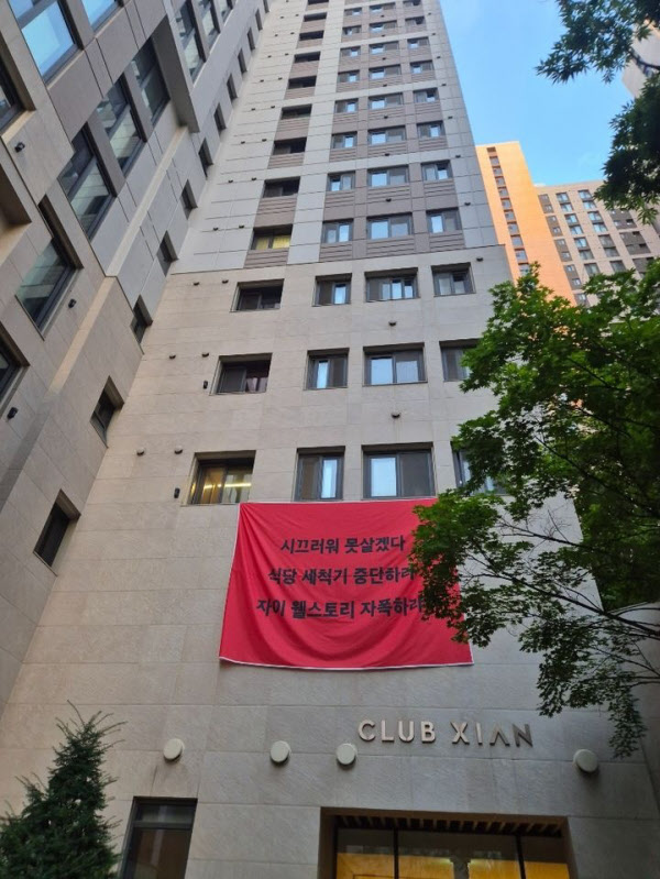 입주자대표회의 측이 삼성웰스토리 측과 협의해 민원을 해결하기 위해 나선 것으로 알려졌다. 업계 관계자는 “식기세척기 하단에 두꺼운 방진 패드 등을 설치하는 등 조치를 취한 것으로 알고 있으며, 화제가 된 현수막은 현재 외벽에서 철거된 상황”이라고 전했다. /leejin0506@chosun.com