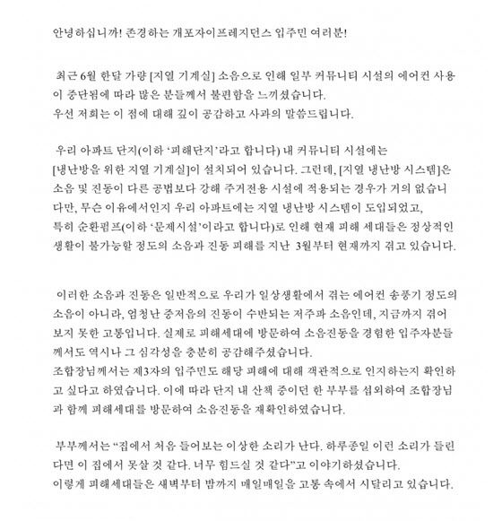 이 현수막에는 ‘시끄러워 못 살겠다, 식당 세척기 당장 중단하라, 자이 웰스토리 자폭하라’는 문구가 적혔다. 내용으로 미루어볼 때 현재 입주민 전용 식사 서비스를 운영하는 지하 1층 식당에서 식기도구들을 세척하며 발생하는 소음과 진동이 건물 위층 주택으로 전달되면서 생활 피해가 발생하고 있는 것으로 보인다.