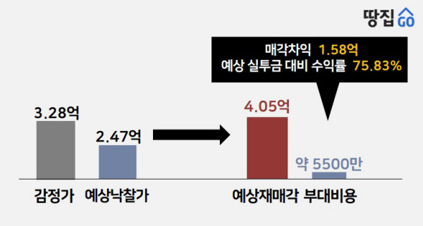 땅집고옥션 AI 분석에 따르면 예상 낙찰가는 2억5000만원 안팎이다. 예상 매각가는 4억509만원이다. 현재 시세도 비슷한 수준이다. 반 년 보유 후 팔면 매각차익은 약 1억6000만원, 세금·각종 비용을 제하면 순수익은 1억원 정도로 추산된다. 예상 자기자본 수익률(ROE)은 76%이다.