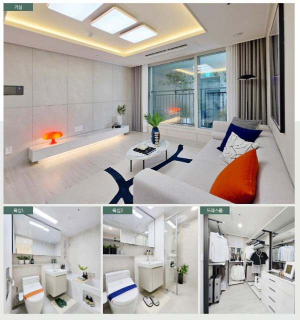 이 평면도를 보면 거실 겸 주방에 침실 3개, 화장실 2개, 알파룸으로 구성하는 이른바 4.5베이 판상형 설계를 적용한 점이 눈에 띈다. 이 중 메인 침실에는 드레스룸이 딸려있고 주방 옆에는 다용도실까지 마련하는 등 수납공간을 두루 갖췄다. 통상 84㎡(34평)에는 침실을 3~4개 넣더라도 면적이 더 작은 59㎡는 2~3개에 그치는 설계가 많은데, 이 단지는 최신 트렌드에 맞춘 공간 구획을 적용한 것.