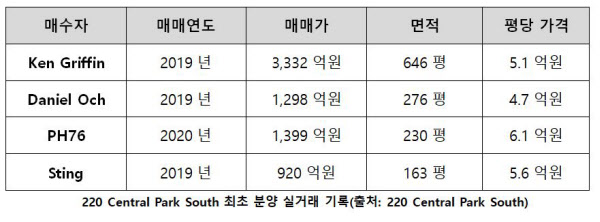 이곳이 주목받게 된 가장 큰 이유는 단 하나였습니다. 바로 센트럴파크를 바로 내려다볼 수 있다는 압도적인 입지입니다. 2010년대 초반부터 들어선 ‘One 57’, ‘432 Park Avenue’, ‘Central Park Tower’, ‘220 Central Park South’ 같은 펜슬 타워들은 모두 ‘센트럴파크 조망’을 앞세워 세계의 슈퍼리치들을 끌어들였습니다. 대체로 성공적인 분양 실적을 기록했습니다. 특히 220 Central Park South의 펜트하우스는 초대형 헤지펀드 시타델의 창업자인 켄 그리핀이 3000억 원이 넘는 가격에 매입하면서 전 세계의 이목을 끌었습니다.