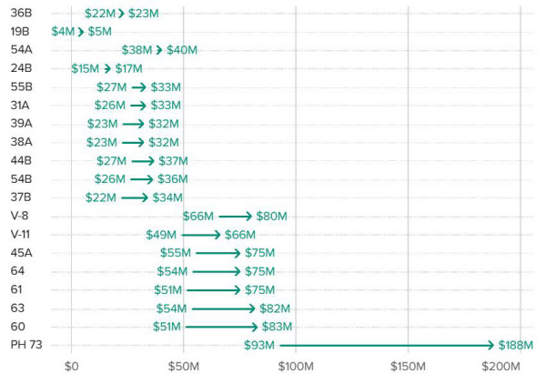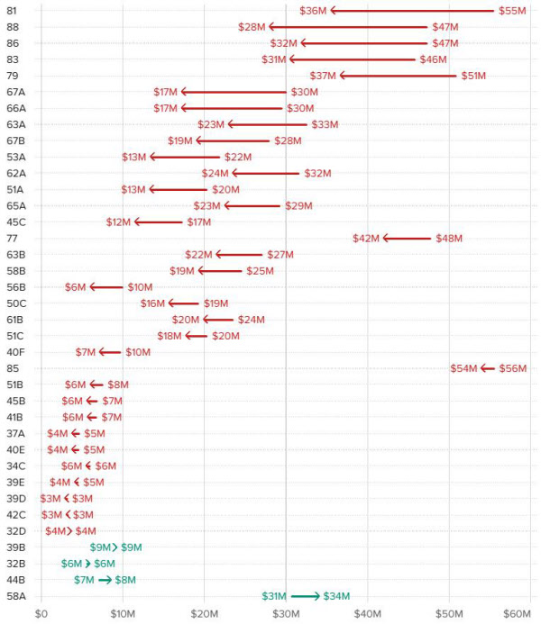 처음의 성공이 지속된 것은 아니었습니다. 분양 당시 화제를 모았던 초고가 유닛들의 가격이 하락했기 때문이죠. 아래 One 57 리세일 자료처럼 대부분의 펜슬 타워들은 추후 매각 시 손실을 기록했습니다.