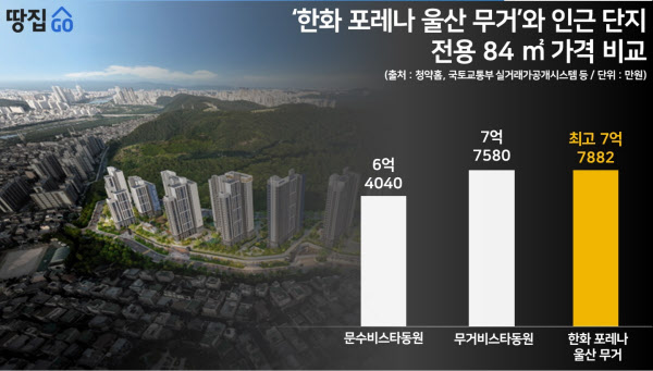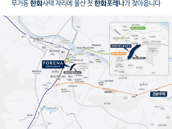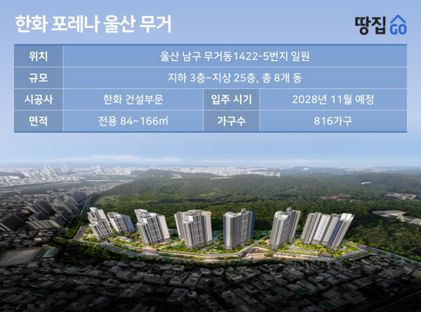 [땅집고] 한화 건설부문이 울산 남구 무거동 1422-5 일대 ‘한화포레나 울산 무거’를 선보인다. 한화케미칼 울산공장 사택 부지를 개발하는 이 단지는 지하 3층~25층, 8개 동, 전용 84~166㎡ 총 816가구 규모다. 한화와 한화솔루션이 지분을 각각 50%씩 보유한 에이치헤리티지가 시행, 한화 건설부문이 시공을 담당한다.