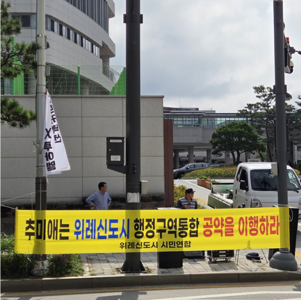 이달 26일 오전 경기 하남시에 있는 추미애 더불어민주당 국회의원 지역 사무실 앞에 샛노란 현수막과 함께 이 같은 외침이 울려퍼졌다. 현수막에는 ‘추미애는 위례신도시 행정구역 통합 공약을 이행하라’는 문구가 큼직하게 적혀 있다.