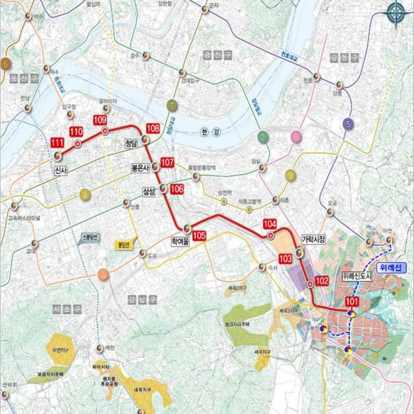 실제로 지금까지 나온 위례신사선 계획도에 따르면 노선은 서울 강남구 신사역에서 시작해 청담·삼성·학여울·가락시장역 등을 거쳐 위례신도시역까지 총 11개역, 14.7㎞ 길이로 건설될 예정이다. 이 중 종착점인 위례신도시역(101정거장)이 위례신도시에 들어서는 유일한 역인데 계획상 신도시 중심부인 위례중앙광장에 지어지는 것으로 추정된다. 서울 송파구에 해당하는 곳이며, 나머지 하남·성남시에는 계획된 위례신사선 전철역이 하나도 없다.