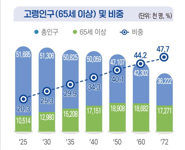고령 인구 비율은 2036년 30%를 넘어서고 2050년 40%를 넘어설 것으로 전망한다. 추계의 마지막 해인 2072년에는 고령 인구 비율이 47.7%에 이를 것으로 추산한다.