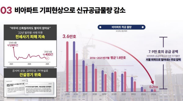 여기에 2022년에는 이른바 '빌라왕 사건'으로 수요자 사이에서 비아파트 기피 분위기가 확산하면서 비아파트 착공물량이 2015년 기준 반기별 평균 3만6000가구에서 지난해 약 2000가구로 공급이 거의 단절되기도 했다.