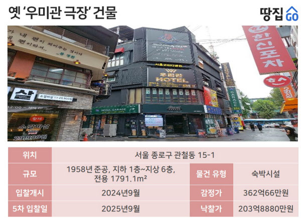 국내 최초 AI 경·공매 분석 플랫폼 땅집고옥션(☞바로가기)에 따르면, 지난달 25일 서울중앙지방법원에서 열린 경매에서 서울 종로구 관철동 15-1일대 옛 우미관 건물이 203억8880만원에 낙찰됐다. 사건번호는 2024타경4705이다.
