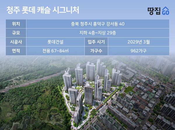 [땅집고] 이달 충북 청주시 흥덕구 강서동에 ‘청주 롯데캐슬시그니처’가 분양한다. 강서2지구 지역주택조합 사업으로 개발하는 단지다. 지하 4층~지상 29층, 10개동, 총 962가구 규모로 이 중 일반분양 물량은 459가구다. 2029년 3월 입주 예정이다. 시공은 롯데건설이 맡았다
