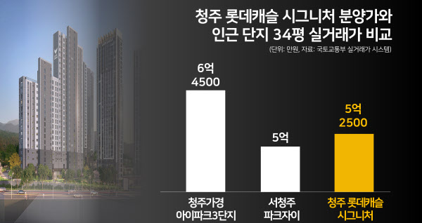 청주 롯데캐슬시그니처 인근에 위치한 비교적 신축급 아파트는 2019년에 입주한 서청주파크자이가 있다. 최근 전용 84㎡는 5억원에 거래됐다. 단순 비교하면 5000만원가량 비싸지만, 연식을 고려하면 큰 차이는 없는 것으로 풀이된다.