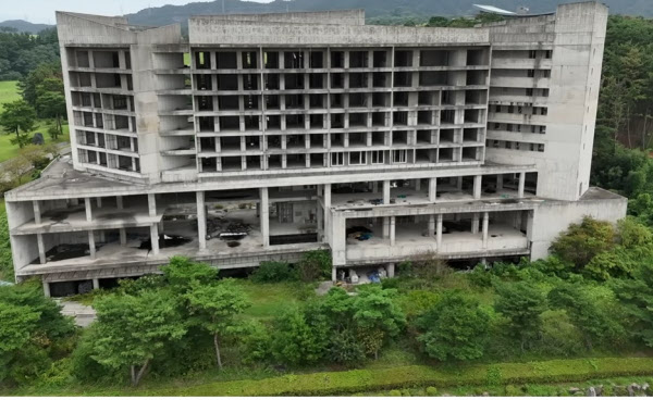 [땅집고] 전북 익산시에 금강하구를 끼고 지어진 골프장 ‘클럽디 금강CC’와 ‘웅포CC’. 각각 18홀짜리 퍼블릭 골프장인데 두 곳이 하나의 클럽하우스를 공유하고 있어 독특하다. 그런데 이 클럽하우스로 진입하는 도로 초입에 웬 흉물 건물이 방치돼있어 방문객들 눈살을 찌푸리게 한다. 당초 골프장과 함께 골프텔로 쓰일 건물이었으나 현재 새까맣게 때가 탄 콘크리트 건물 뼈대만 남아있다.