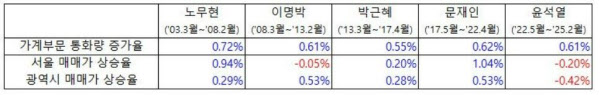 [땅집고] “한때는 진보 정권이 ‘돈을 많이 풀어서’로 집값이 많이 오른다는 시각이 있었습니다. 그런데 가계부문 통화량 증가율은 노무현 정부만 높았고, 입주 물량은 문재인 정부가 많았어요. 엄청난 집값 차이는 결국 정책 차이에서 비롯된 결과입니다.”
